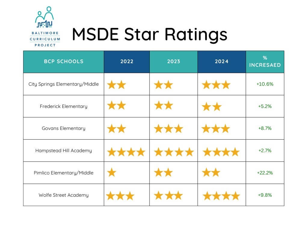 However, the story of the Baltimore Curriculum Project’s (BCP) six neighborhood conversion charter schools is one of recovery and resilience. Since 2022, all six BCP schools have increased their total points earned in the Star Rankings, some making huge strides and resulting in an additional star. This is a testament to the dedication of our principals, faculty, staff, and parents and to the quality of the BCP program.