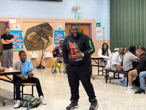 Black Chakra, a Baltimore-based spoken word and hip-hop artist, is a national poetry slam champion and youth poetry teacher for DewMore Baltimore. In anticipation of reading Long Way Down by Jason Reynolods, the 8th grade read the poems of several Baltimore poets. They voted Black Chakra as their favorite poet, and Mr. Oroke (known as Mr. “O” to the City Springs community) arranged Black Chakra’s visit to City Springs.